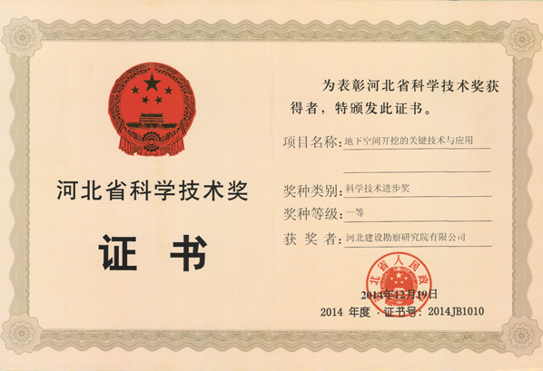 2015年2月26日,省委、省政府在石家莊召開全省科技創(chuàng)新暨科學(xué)技術(shù)獎勵大會,省委書記、省人大常委會主任周本順,省委副書記、省長張慶偉出席會議并講話。會上,副省長許寧宣讀了省政府關(guān)于2014年度河北省科學(xué)技術(shù)獎勵的決定,公布了獲獎項目(人員)名單。我公司申報的項目“地下空間開挖的關(guān)鍵技術(shù)與應(yīng)用”榮獲2014年度河北省科學(xué)技術(shù)進步獎一等獎。