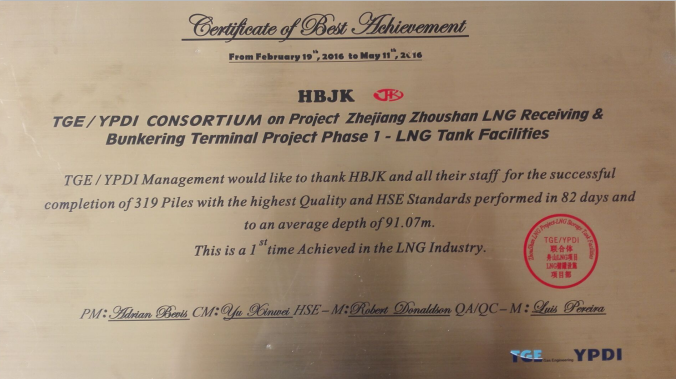 近日我公司收到TGE/YPDI的浙江舟山LNG儲罐接收站項目“最佳成績證書”牌匾,內容:TGE/YPDI 管理層對2016年2月19日至2016年5月11日期間河北建勘及其員工以高質量和嚴格的HSE管理標準在82天內完成319根樁基且平均深度在91.07米的成績表示感謝。