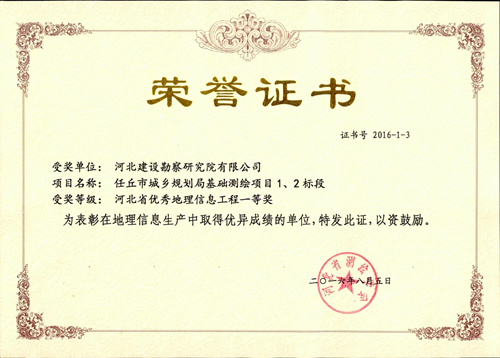 8月5日,我公司承擔的任丘市城鄉規劃局基礎測繪項目1、2標段被河北省測繪學會評為河北省優秀地理信息工程一等獎;8月15日,我公司承擔的滄州臨港經濟技術開發區(西區)控制測量及1∶500地形圖測繪項目被河北省測繪學會評為河北省測繪學會科學技術三等獎。