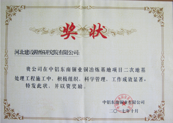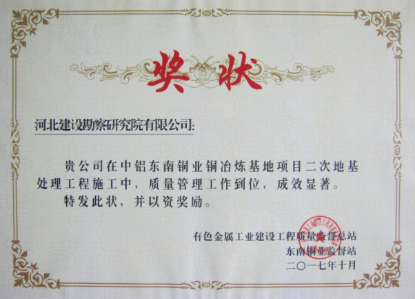 公司承接的福建省寧德市中鋁東南銅業(yè)銅冶煉基地項(xiàng)目二次地基處理工程,施工中嚴(yán)格執(zhí)行公司規(guī)章制度及綜合管理體系標(biāo)準(zhǔn),精心策劃,嚴(yán)格控制,科學(xué)管理。在現(xiàn)場10多家施工單位各項(xiàng)檢查評比中,得到了業(yè)主中鋁東南銅業(yè)有限公司的表揚(yáng),對現(xiàn)場安全、質(zhì)量、進(jìn)度管理給予了高度評價,分別授予“項(xiàng)目管理突出”獎和“質(zhì)量管理”獎。