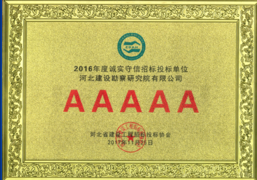近日,我公司被河北省建設工程招標投標協會評為2016年度河北省建設工程招標投標誠實守信5A級施工企業。