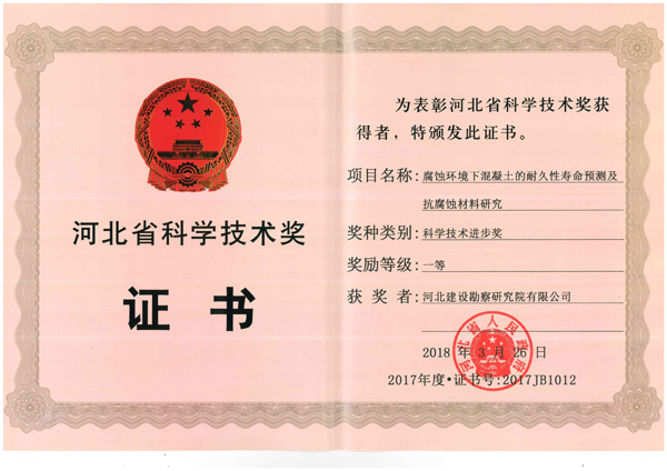 5月30日上午,河北省科學技術(shù)獎勵暨慶祝“全國科技工作者日”大會在石家莊舉行。省委書記王東峰、省長許勤等省領(lǐng)導(dǎo)出席大會,并為榮獲2017年度河北省科學技術(shù)獎勵代表和第十屆河北省優(yōu)秀科技工作者代表頒發(fā)證書。我公司《腐蝕環(huán)境下混凝土的耐久性壽命預(yù)測及抗腐蝕材料研究》獲省科技進步一等獎、《素混凝土剛性樁復(fù)合地基核心技術(shù)研究與工程應(yīng)用》獲三等獎,聶慶科總工程師代表公司參加了大會并上臺領(lǐng)獎。這是我公司繼2014、2015年度后再獲河北省科技進步一等獎,對我們既是極大鼓舞和肯定,也必將激勵和鞭策廣大專業(yè)技術(shù)人員,以黨的十九大精神和習總書記在兩院院士大會講話精神為指引,積極投身創(chuàng)新實踐,大力開展科研攻關(guān),為不斷推進巖土工程技術(shù)發(fā)展、提升企業(yè)創(chuàng)新能力和核心競爭力而繼續(xù)努力奮斗。