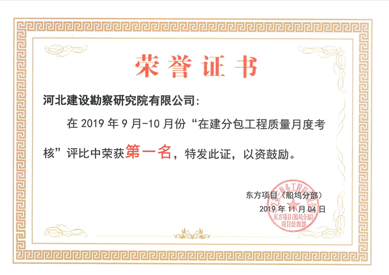 我公司俄羅斯東方船廠項目部,在2019年9月-10月份整個東方船廠項目十幾家施工單位質量月度考核評比中,榮獲第一名的好成績。