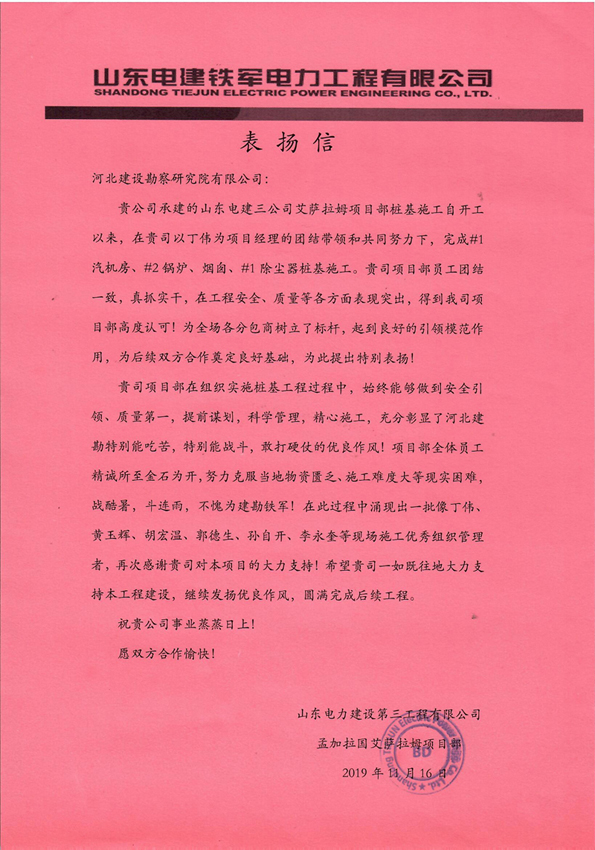 近日,由我公司承建的孟加拉艾薩拉姆項目樁基工程收到總包單位山東電建三公司的表揚信,經過項目部全體員工的辛勤付出,得到總包單位的高度認可,為后續雙方合作奠定良好基礎。這充分彰顯了河北建勘人的風采,充分體現了河北建勘人的鐵軍精神,充分展示了河北建勘的戰斗力和實力,為我司業務在孟加拉更好更快發展提供了保證。項目部全體員工一定會珍惜榮譽,珍視公司良好發展平臺,再接再厲,圓滿完成后續施工任務!
