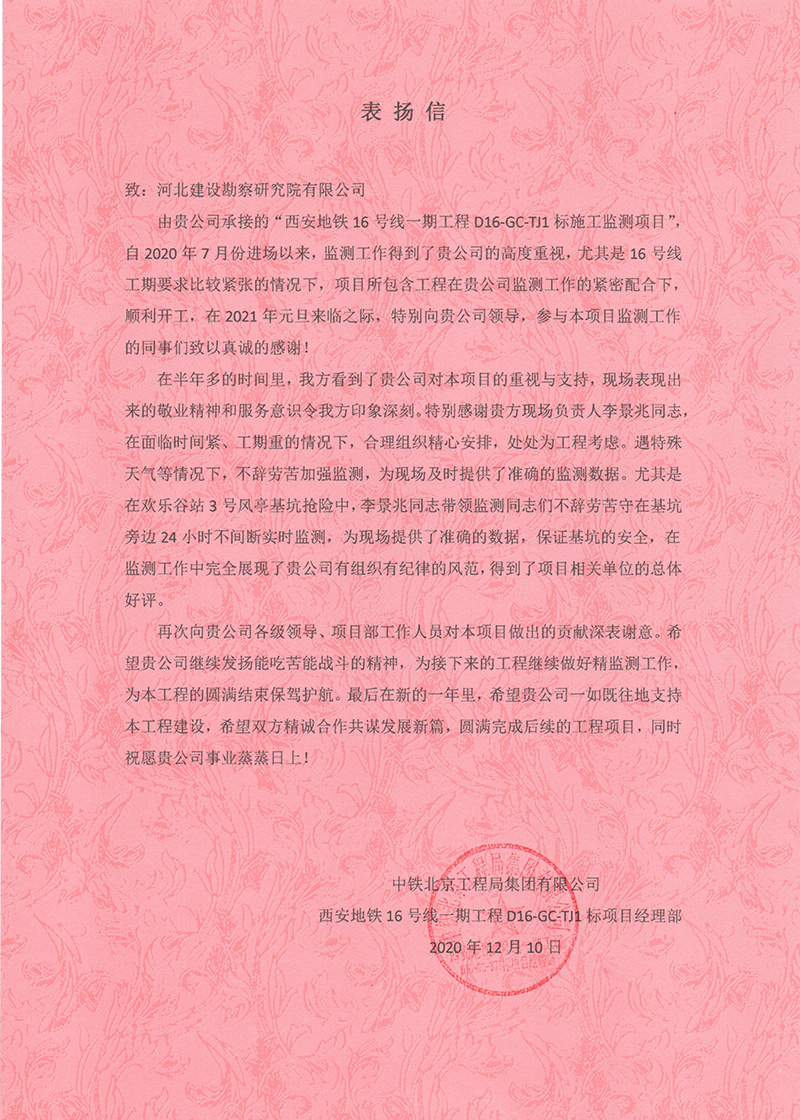近日,公司收到中鐵北京工程局集團(tuán)有限公司西安地鐵16號(hào)線一期工程D16-GC-TJ1標(biāo)項(xiàng)目經(jīng)理部的表?yè)P(yáng)信。