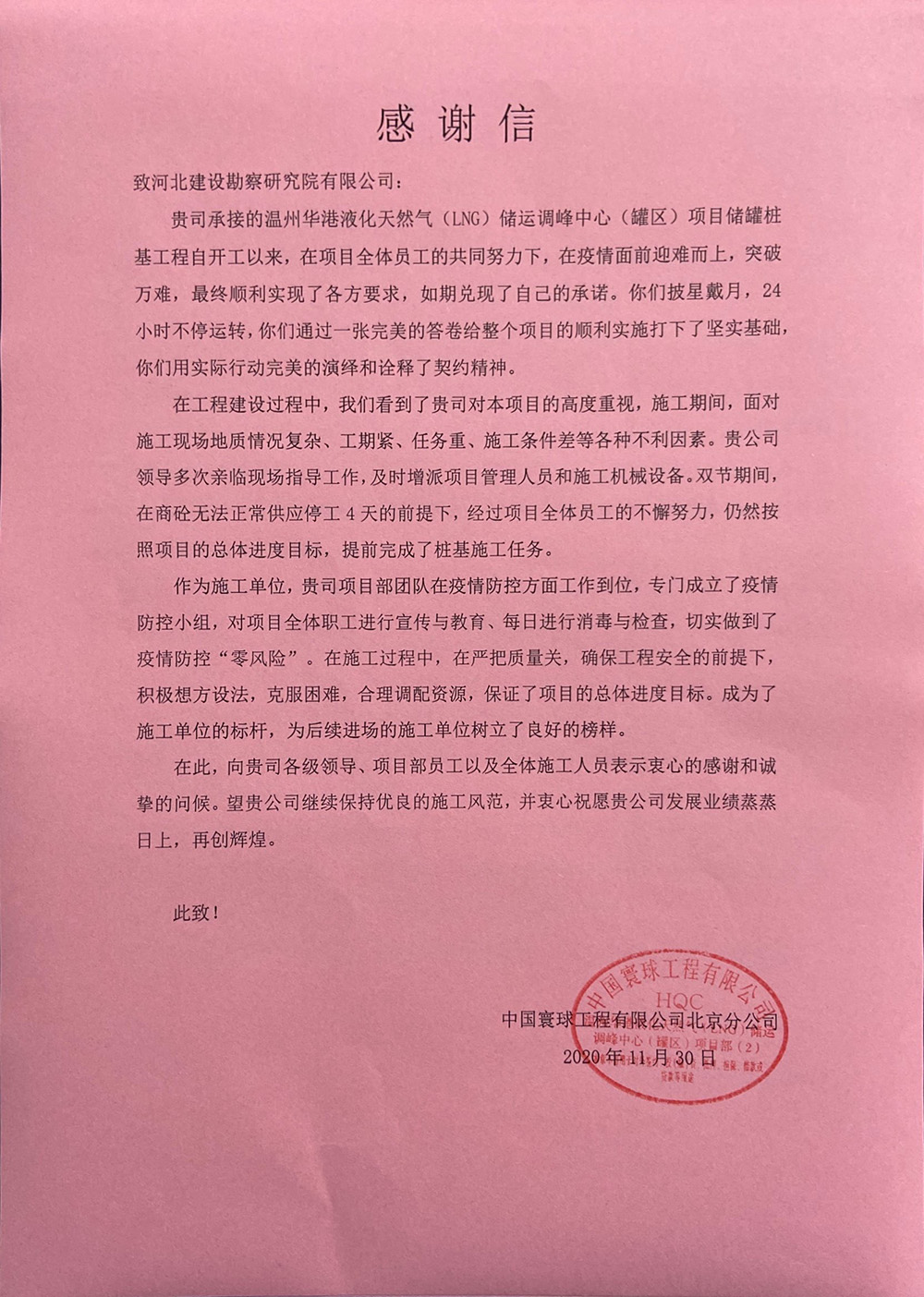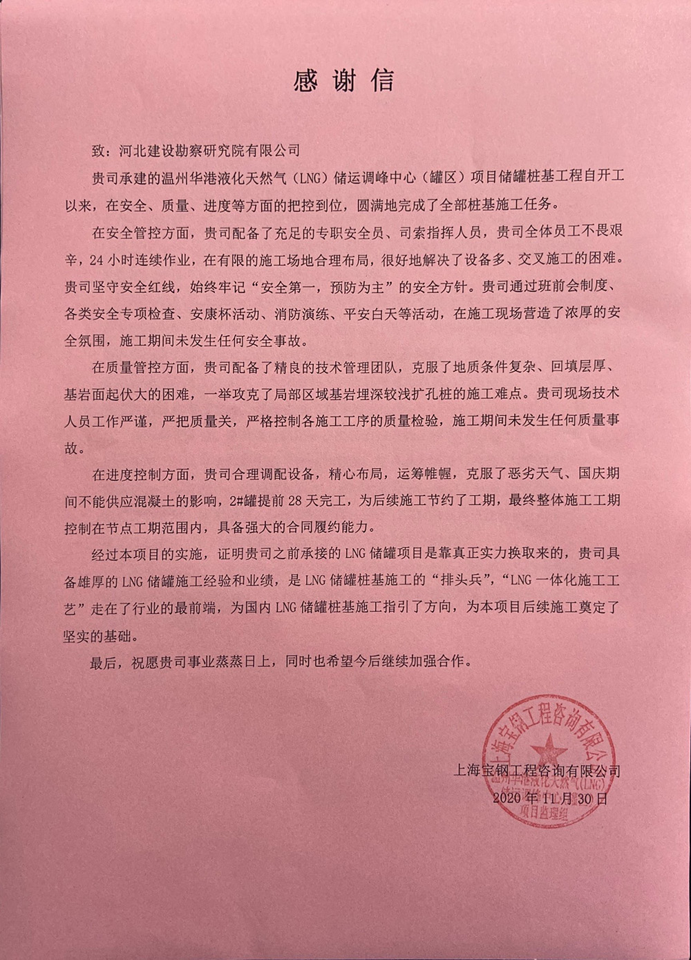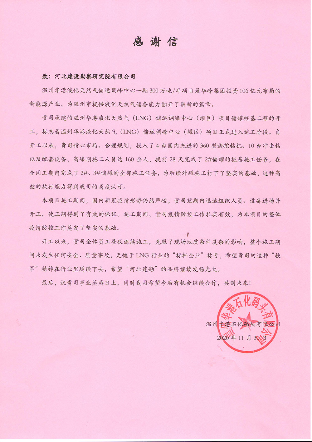 近日我公司溫州華港LNG項(xiàng)目部喜獲業(yè)主、總包、監(jiān)理的表?yè)P(yáng)信,這是對(duì)項(xiàng)目部全體參建人員不畏艱難、頑強(qiáng)拼搏、攻堅(jiān)克難的施工精神的認(rèn)可和贊揚(yáng),更是對(duì)河北建勘高度的肯定。