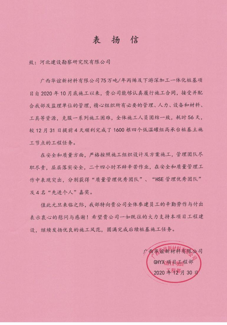 廣西華誼新材料有限公司75萬噸/年丙烯及下游深加工一體化樁基項目部,近日收到來自甲方的表揚(yáng)信及嘉獎。