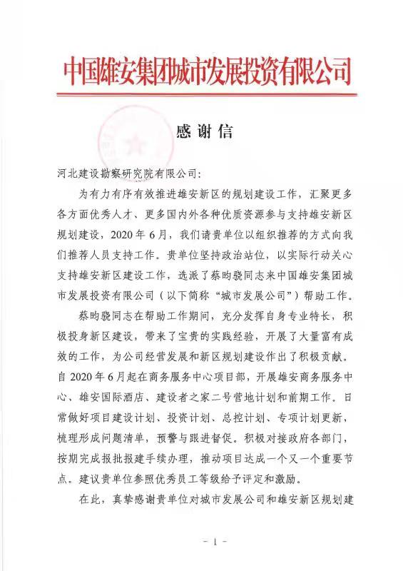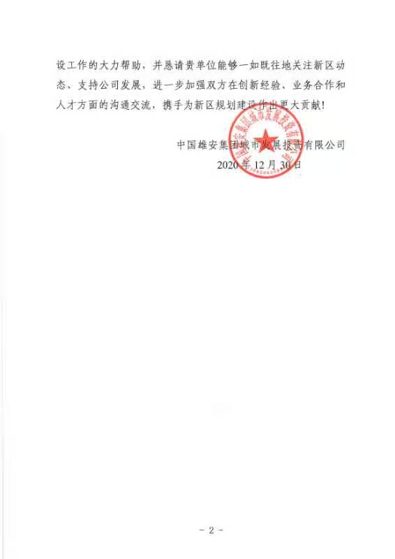 中國雄安集團城市發展投資有限公司感謝我公司以實際行動關心支持雄安新區建設工作,希望我公司一如既往地關注新區動態,支持公司發展,進一步加強雙方在創新經驗、業務合作和人才方面的溝通交流,攜手為新區規劃建設作出更大貢獻。