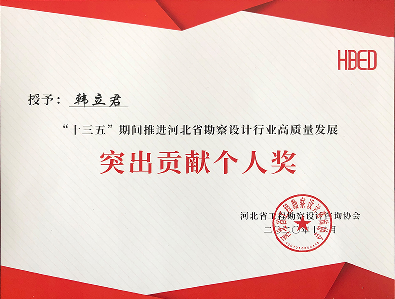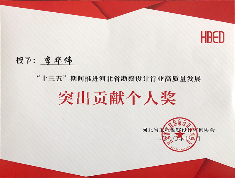 由河北省工程勘察設計咨詢協會評選,公司榮獲“十三五”期間推進河北省勘察設計行業高質量發展突出貢獻單位,韓立君董事長、李華偉總經理、商衛東主任榮獲“十三五”期間“推進河北省勘察設計行業高質量發展突出貢獻個人”。