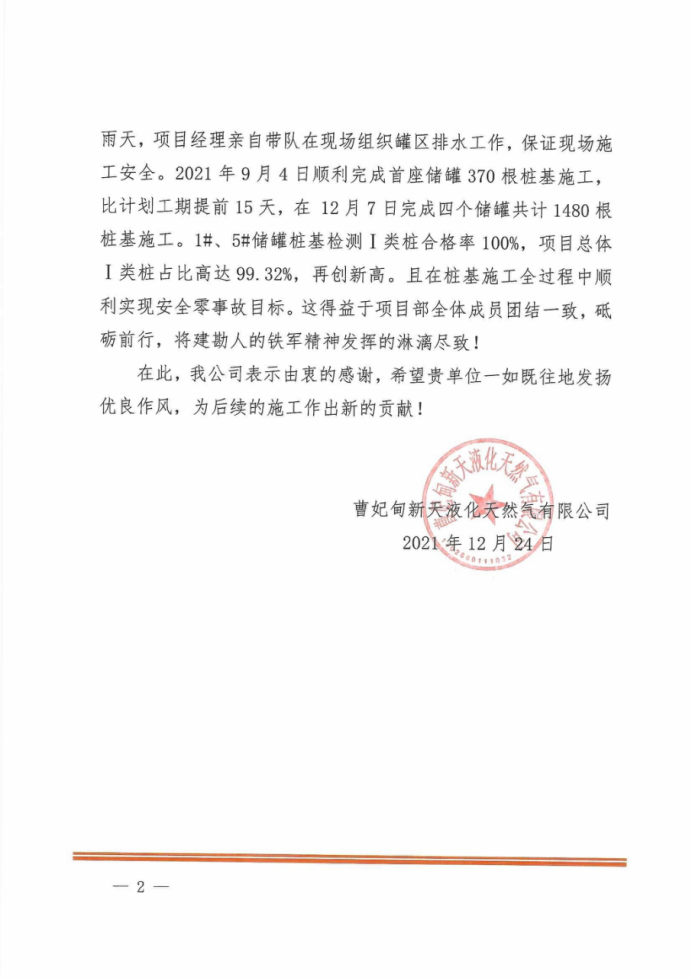 唐山LNG項目接收站二階段工程樁基工程項目部建設規模為4座20萬m³LNG儲罐,項目順利實現質量零事故、安全零事故目標,贏得總包、監理及業主的一致認可與高度肯定。