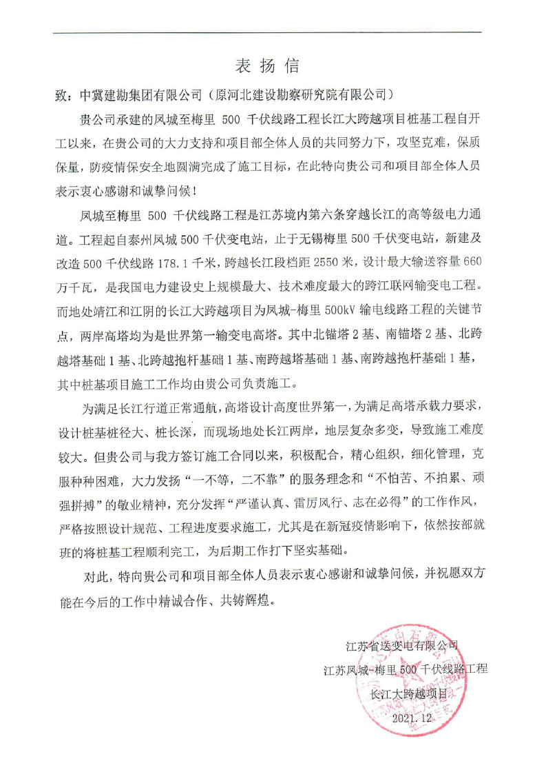 江蘇鳳城梅里500千伏線路工程長江大跨越項目樁基工程,甘肅國能靖遠風電項目電場及配套110KV輸變電工程賀寨柯風電場風機基礎及樁基工程項目業主向我公司發來表揚信,并頒發了“進度、質量管理先進單位”榮譽證書,同時,武衛新、朱凱云、黃長楠被評為“優秀項目管理者”榮譽稱號。