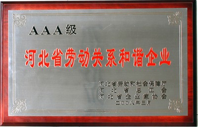 3月28日在河北會堂召開的“河北省創(chuàng)建勞動關(guān)系和諧企業(yè)表彰會”上,我公司被授于“河北省AAA級勞動關(guān)系和諧企業(yè)”。省委常委、省總工會主席藏勝業(yè)同志向公司董事長韓立君同志頒發(fā)了獎牌。
