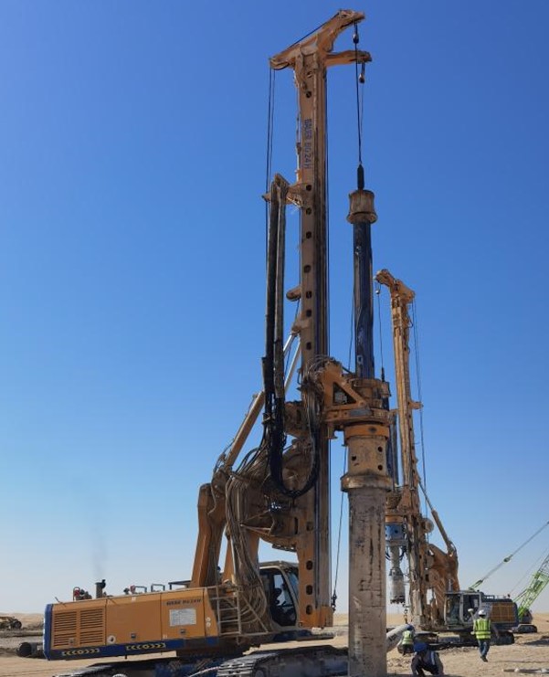 該項目位于迪拜,是穆罕默德·本·拉希德·阿勒馬克圖姆太陽能公園的第四區(qū)。受中建三局委托,我公司承擔(dān)本項目樁基施工,采用公司自有旋挖鉆機及錨桿鉆機進行干孔灌注樁施工工藝施工,共完成混凝土灌注樁9874根,灌注樁樁身完整性檢測3300根,水平側(cè)向載荷試驗36根,驗證荷載試驗7根。
