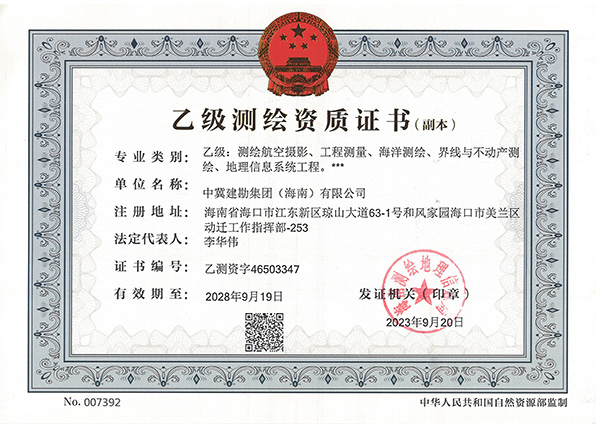 在集團公司領導的正確領導下,經(jīng)過工程測量公司和安全生產(chǎn)部的精心運作,中冀建勘集團(海南)有限公司于2023年9月20日取得了海南測繪地理信息局頒發(fā)的測繪乙級資質,資質包含五個專業(yè):測繪航空攝影、工程測量、海洋測繪、界線與不動產(chǎn)測繪、地理信息系統(tǒng)工程。