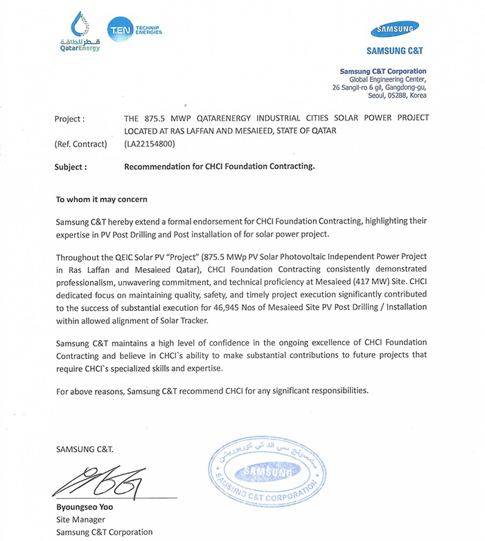 我公司收到卡塔爾能源875.5MW光伏發電項目業主方卡塔爾能源和總包方三星C&T公司聯合頒發的獎杯和推薦信。業主及總包方高度認可我公司項目履約能力,贊揚我司對該項目成功交付做出重大貢獻,表示愿意與我司建立長期合作關系。基于我司卓越的履約表現,三星C&T公司授予我司推薦信。