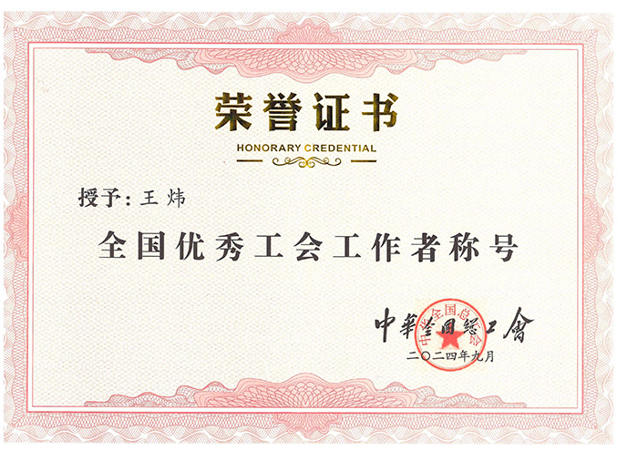 王煒同志榮獲中華全國總工會(huì)“全國優(yōu)秀工會(huì)工作者”榮譽(yù)稱號(hào)