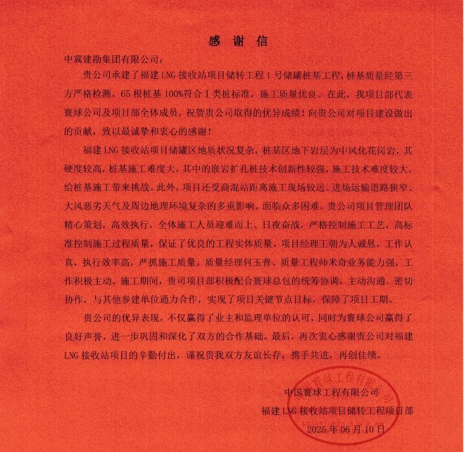 2025年6月12日,我公司收到中國寰球福建LNG接收站項目儲轉工程項目發來的感謝信。信中高度贊揚了我公司在項目執行過程中展現出的項目高效的團隊管理、精心策劃、高效執行。